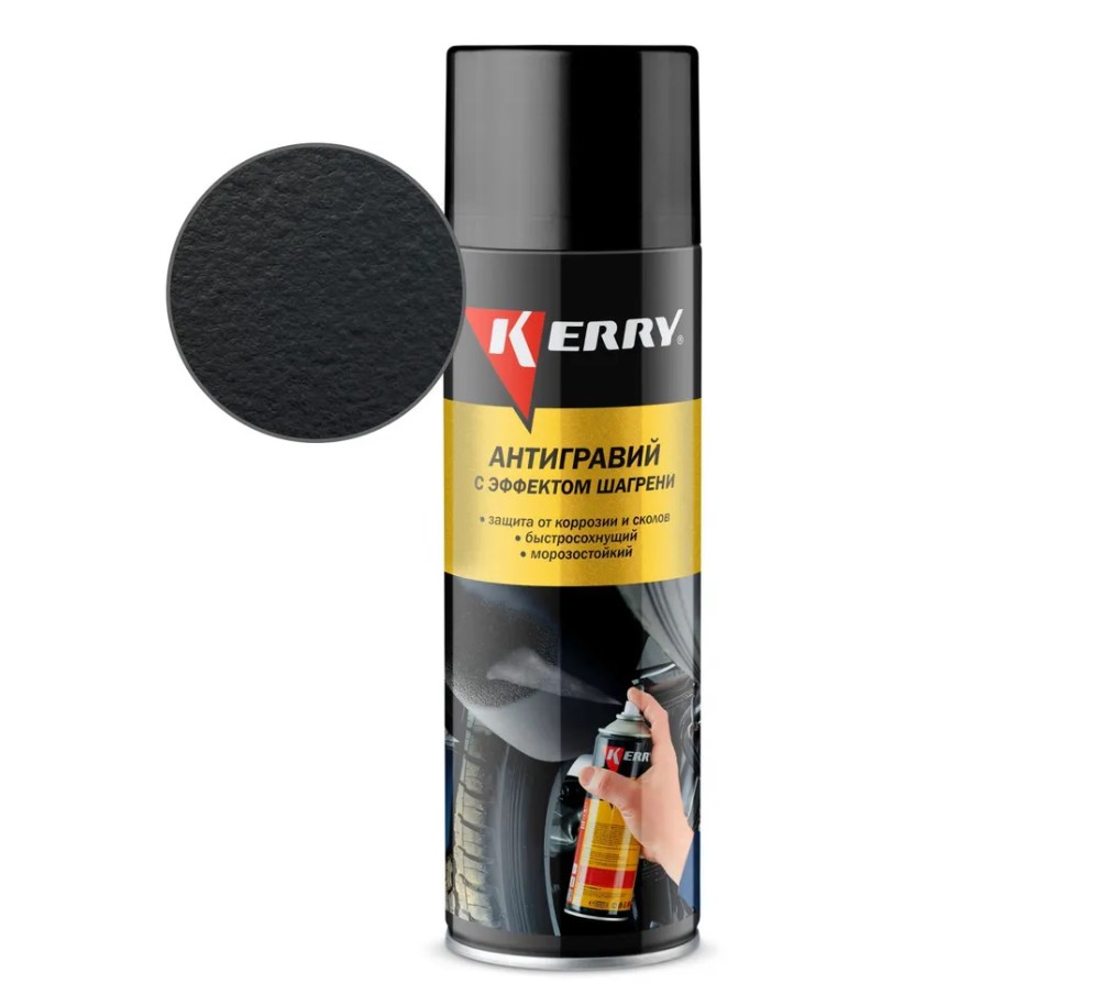 Профессиональное средство Антигравий KERRY с эффектом шагрени чёрный KR-971 для восстановления текстурных покрытий на новых и ремонтируемых деталях автомобилей (колесные арки, пороги, крылья и т.п.) и создания долговременной защиты от летящих камней и песка, создающих интенсивную абразивную нагрузку. Способно предотвращать повреждения элементов нижней части кузовов легковых автомобилей и прочих транспортных средств. Обладает хорошей адгезией и звукоизоляционными свойствами, устойчиво к перепадам температур, сохраняет эластичность в холодное время года, не растрескивается и не отслаивается на морозе. Быстро сохнет, после высыхания может быть окрашено большинством эмалей.