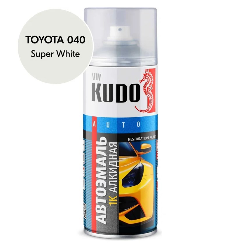Автомобильная ремонтная эмаль KUDO "Toyota 040 Super White" 520 мл 42400 11605084 однокомпонентная воздушной сушки предназначена для ремонтной окраски кузова и других деталей автомобиля, а также для любых предварительно загрунтованных поверхностей. Автомобильная аэрозольная краска имеет хорошую укрывистость. Покрытие обладает прекрасным блеском, светостойкостью, атмосферостойкостью, превосходной адгезией к окрашиваемой поверхности, устойчивостью к механическим воздействиям и истиранию.