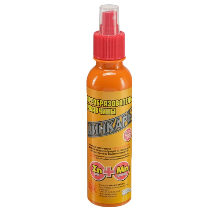 Препарат уникальной разработки, в котором совмещены два принципа антикоррозийной защиты: электрохимическая и консервационная. Электрохимическая защита обеспечивается наличием в составе цинка. Консервационная – марганцем. Предназначен для обработки стальных поверхностей с целью удаления коррозионных поражений и защиты обработанных поверхностей от последующих воздействий атмосферных явлений и агрессивных реагентов. После обработки следует нанести дополнительное защитное покрытие (грунт, краска). Емкость с преобразователем оснащена удобным распылителем – триггером. Использовать просто и легко, не нужны дополнительные инструменты для нанесения.