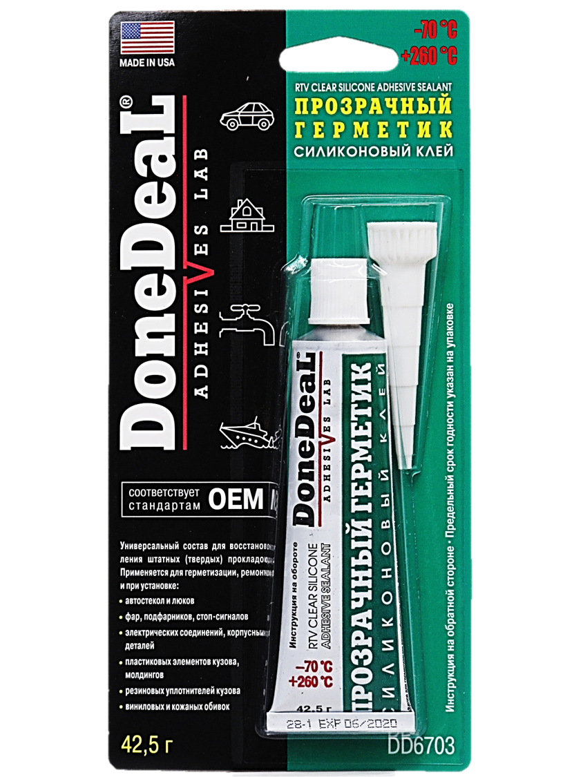 Рабочий диапазон температур: от -75C до +235C. Прозрачный, водонепроницаемый силиконовый герметик-клей широкого диапазона использования. Заполняет пустоты и неплотности. Используется для установки, ремонта и герметизации автомобильных стекол, люков и осветительных приборов, внутренних отделочных панелей, приборных досок. Благодаря высокой влагоустойчивости и широкому рабочему диапазону температур, может применяться снаружи, внутри и в подкапотном пространстве автомобиля. Используется как универсальный материал для замены штатных (твердых) прокладок. Обладает прекрасной адгезией к стеклу, пластику, металлу, резине, дереву, керамике. Выдерживает ударные и вибрационные нагрузки. Применяется при герметизации корпусов электрических приборов, проводов и контактов. Устойчив к действию агрессивных сред и автомобильных технических жидкостей.