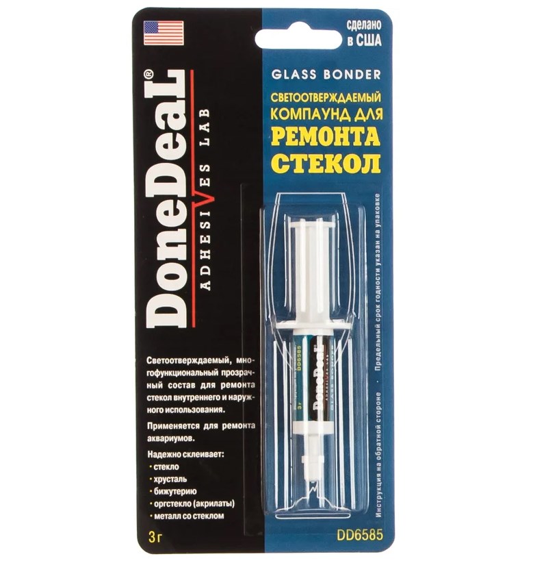 Светоотверждаемый компаунд для ремонта стекол 3 г. Done Deal DD6585 - средство, которое надежно склеивает стекло, бижутерию, хрусталь, оргстекло, восстанавливая оптические свойства и прозрачность. Продукт подходит для внутреннего и наружного использования.