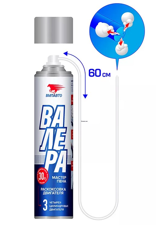 Валера мастер-пена — это инновационная пенная раскоксовка для очистки клапанов, впускного тракта, камеры сгорания, компрессионных поршневых колец. Без едкого запаха. Пенный состав предназначен для очистки бензиновых и дизельных ДВС от высокотемпературных углеродистых отложений: нагар, шлам. Удаляет отложения на клапанах, во впускном коллекторе, верхней части поршня, в области первого поршневого кольца. Может использоваться для очистки клапана EGR, турбокомпрессора и иных деталей из алюминия, стали, чугуна. Очищает лучше за счет 5 циклов смачивания, растворения и смывания нагара.