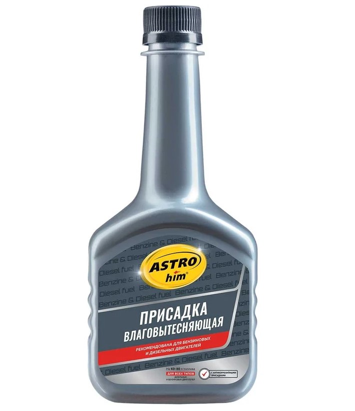 Влаговытесняющая присадка ASTROhim 300мл AC110 используется для удаления воды из топливного бака с целью предотвращения обледенения топливной системы. Жидкость заливается непосредственно в топливный бак, один флакон рассчитан на 60-80 литров топлива.