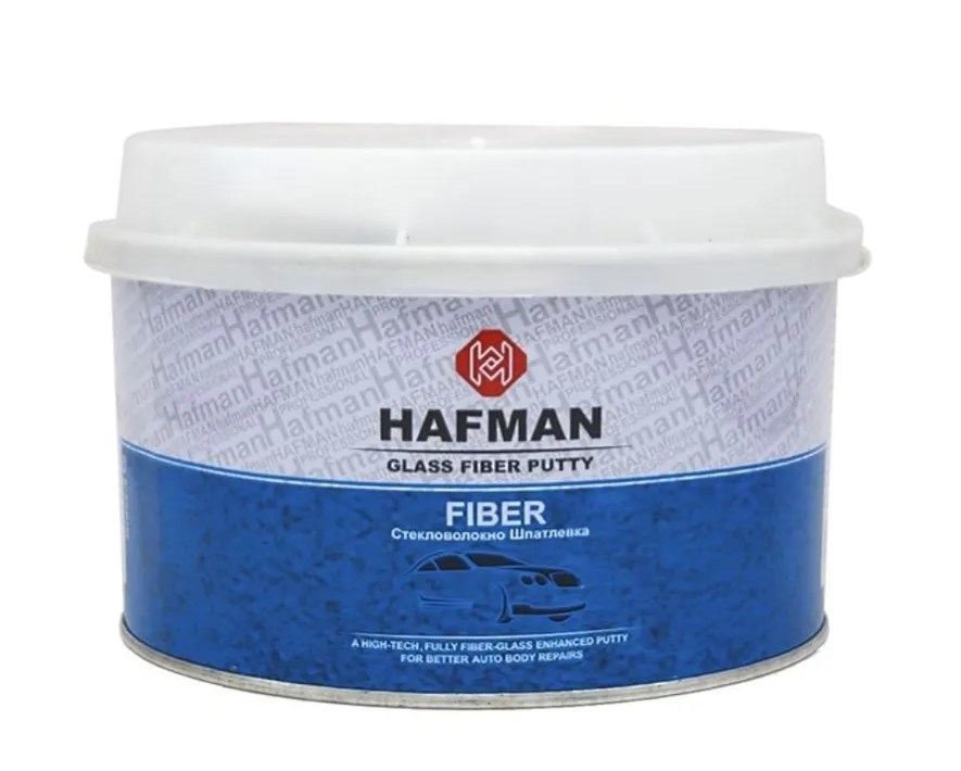 HAFMAN FIBER в фасовке 500 грамм - двухкомпонентная полиэфирная шпаклёвка повышенной прочности с наполнителем из стекловолокна.