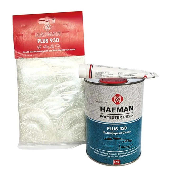 Полиэфирный ремкомплект Hafman Plus 920 Polyester Resin представляет собой готовый набор материалов на основе полиэфирной смолы с отвердителем и стекломатом для автомобильного ремонта, а также восстановления деталей, изготовленных из различных материалов, таких как пластик, металл, керамика, дерево и другие. После высыхания состав представляет собой очень прочную, эластичную и долговечную поверхность. Применяется для ремонта пораженного сквозной коррозией металла и изготовления элементов автотюнинга. Не наносить на старые термопластичные покрытия и фосфатирующие грунты. Добавлять отвердитель в смолу около 2-3%, время жизни готовой смеси ограничено. Воздушная сушка около 1 часа при 20 °С. Устранить липкость поверхности после высыхания можно с помощью растворителя.