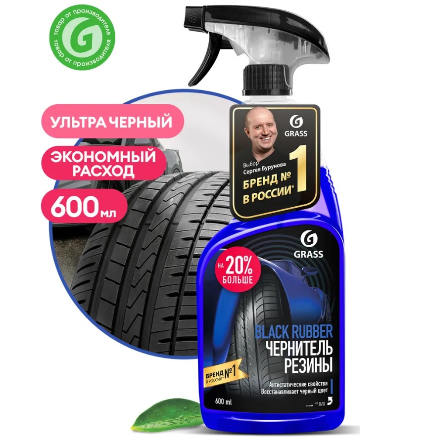 Чернитель шин GRASS Black rubber (флакон 600 мл) - профессиональный состав на водной основе для очистки и полировки шин, а также других резиновых деталей автомобиля. Восстанавливает черный цвет, обновляет поверхность. Придает глянцевый блеск. Предохраняет от растрескивания, старения и потери цвета. Придает поверхности антистатические свойства.