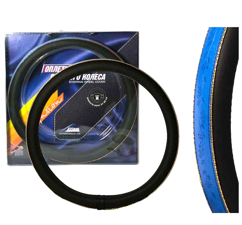 Описание товара: Оплетка руля комбинированная (M) (655) экокожа синяя золотая окантовка подарочная упаковка 44
