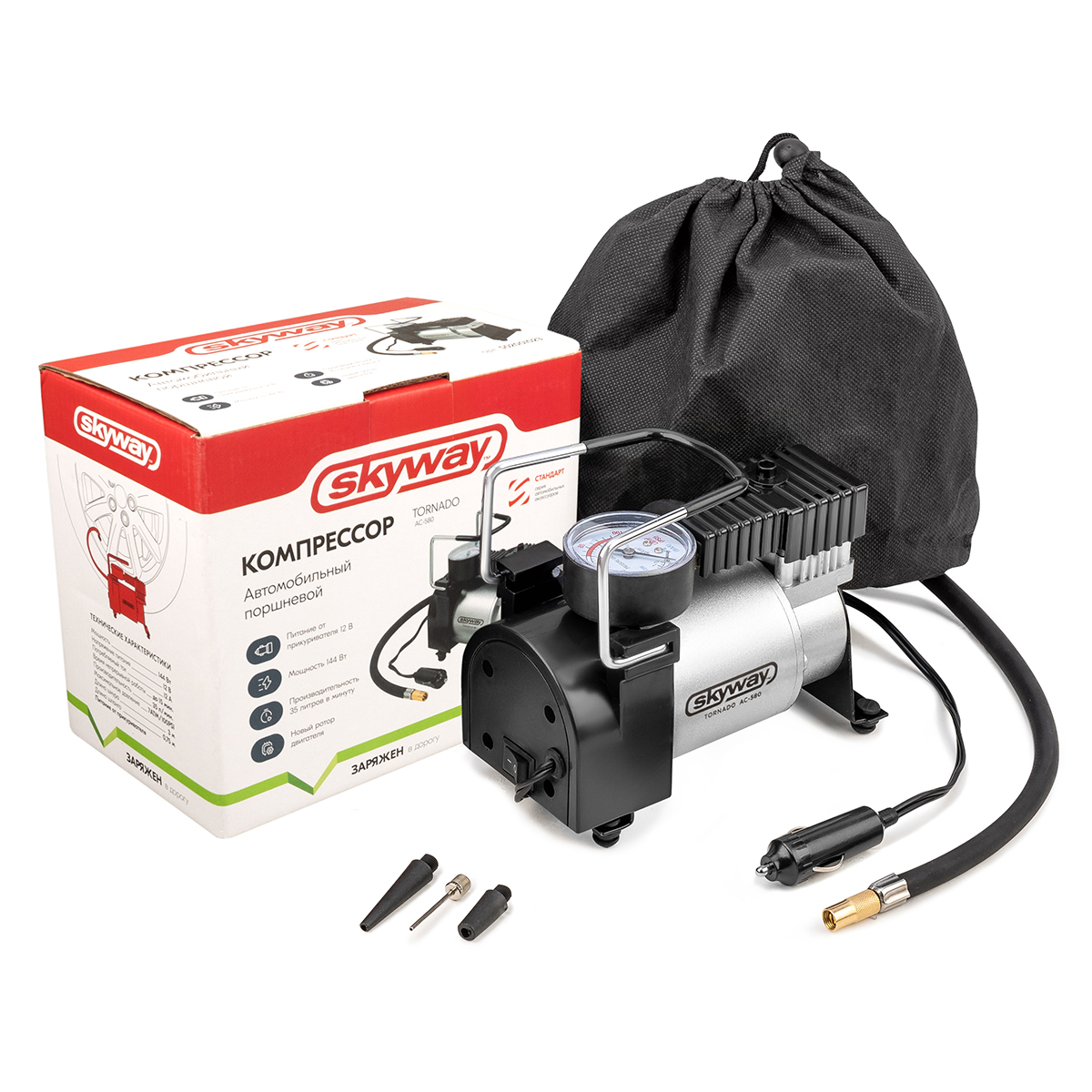 Компрессор металлический 35 л/мин в прикуриватель ТОРНАДО АС-580 СТАНДАРТ SKYWAY - используется для подкачки шин, предметов бытового назначения, игрушек и прочих изделий. Имеет мощный электродвигатель и повышенную систему безопасности. Металлические части основных деталей, а также подшипники обеспечивают надежность, долговечность и высокий ресурс работы компрессора. Устройство рассчитано на длительную эксплуатацию в суровых климатических условиях. Детали, которые подвергаются трению, обработаны специальной смазкой. Благодаря амортизационной опоре, компрессор устоит на любой поверхности. Компрессор может оказаться незаменимым помощником на даче или пикнике, так как в комплекте имеются различные переходники для накачивания надувных матрасов, резиновых лодок и мячей. Для удобства хранения и переноски компрессор укомплектован сумкой. Позвольте себе высокое качество по доступной цене!