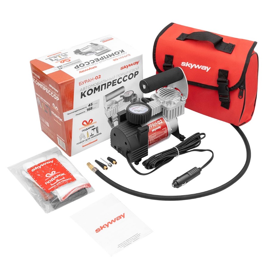 Компрессор металлический 45л/мин в прикуриватель SKYWAY БУРАН-02 Сумка, 10атм - при своих небольших размерах обладает производительностью 45 л/мин. Металлические корпус и поршневой механизм, с компрессионным кольцом из жароустойчивого и прочного тефлона, обеспечивают его долговечность и стабильную работу. Использование высококачественных материалов обеспечивают гибкость шланга и кабеля при низких температурах, а двойное армирование шланга дает высокую защиту от повреждений.