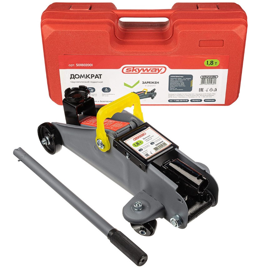 Домкрат гидравлический подкатной 1,8т h 140-300мм SKYWAY в кейсе - полностью металлическая конструкция узлов и агрегатов обеспечивает высокую надежность и отказоустойчивость. Перепускной клапан предохраняет домкрат от поломки, если вес груза превышает грузоподъемность домкрата.