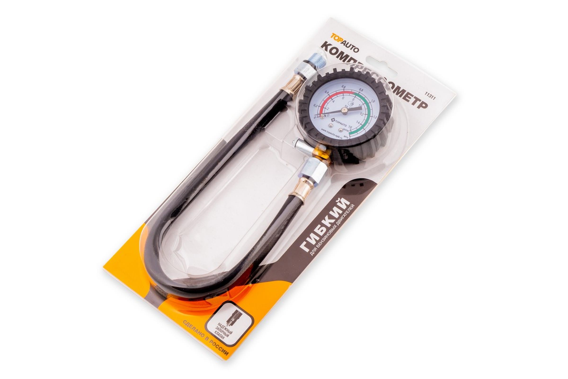 Компрессометр TOPAUTO ТОП АВТО гибкий со шлангом, манометр в резиновом чехле 11311 служит для контроля показателей компрессии. Подходит для обслуживания бензиновых двигателей.