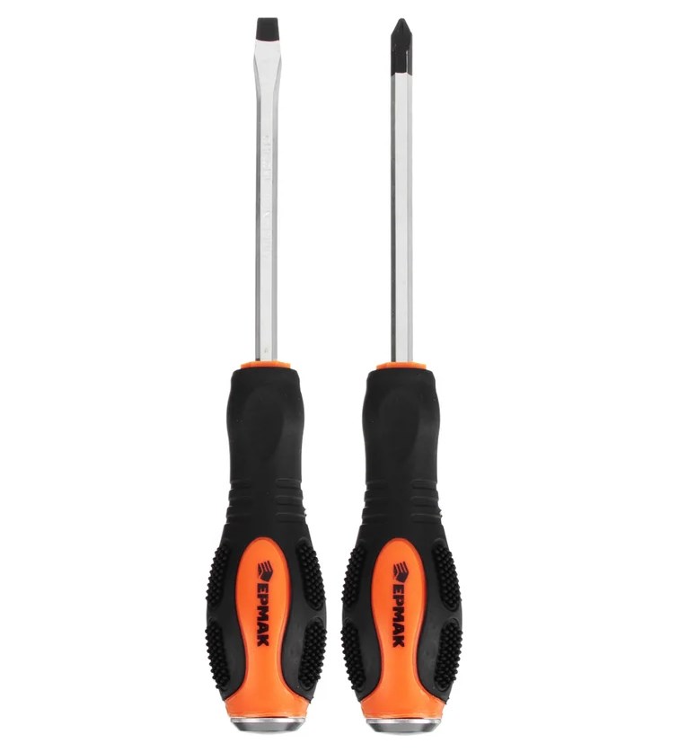 Набор ударных отверток Ермак - это две отвертки со стальным затылком. Их используют, чтобы откручивать прикипевшие или плотно посаженные винты. По отверткам можно бить молотком, чтобы простучать прикипевший крепеж. В наборе крестовая и плоская отвертки. Крестовая стандарта PH2х100 - шлиц без насечек, подходит для крепежей диамтером 3,1 – 5 мм. Плоская SL6x100 - шлиц шириной 6 мм. Длина рабочей части 100 мм. Материал - сталь марки 45: выдерживает удары, высокое давление и скручивание. Ручки удобной формы с насечками - отвертки не скользят в руке. Намагниченные шлицы, удобные ручки и прочные жесткие стержни помогают передать максимум усилия на крепеж.
