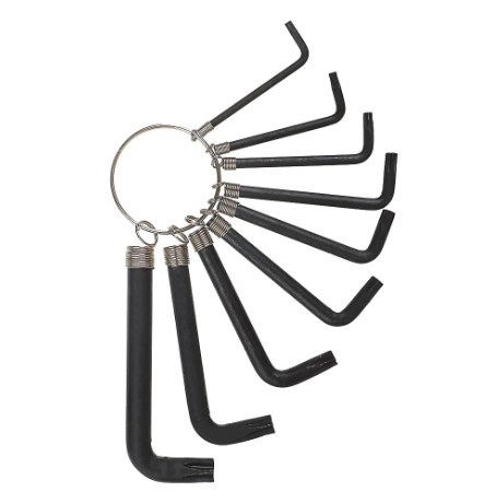 Набор ключей TORX включает 9 предметов с размерным рядом от T9 до T45. Ключи соединены в комплект при помощи кольца для удобства хранения и транспортировки. Качественная сталь обеспечивает высокие эксплуатационные свойства и повышенную прочность, что предохраняет шлицы от деформации.