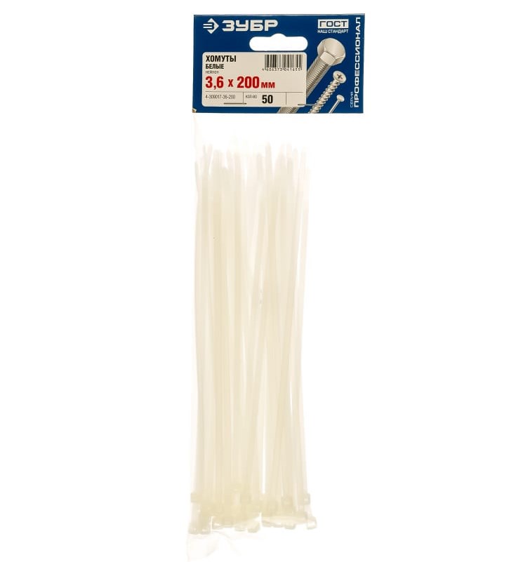 Описание товара: Хомут ленточный нейлон стяжка 200*3,6мм Зубр белые Усиленные 50шт