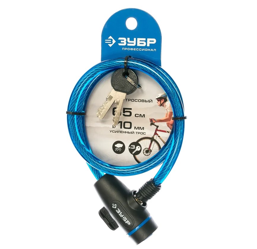 Описание товара: Замок тросовый Зубр 3 ключа d=10мм длина 65см 37261-65